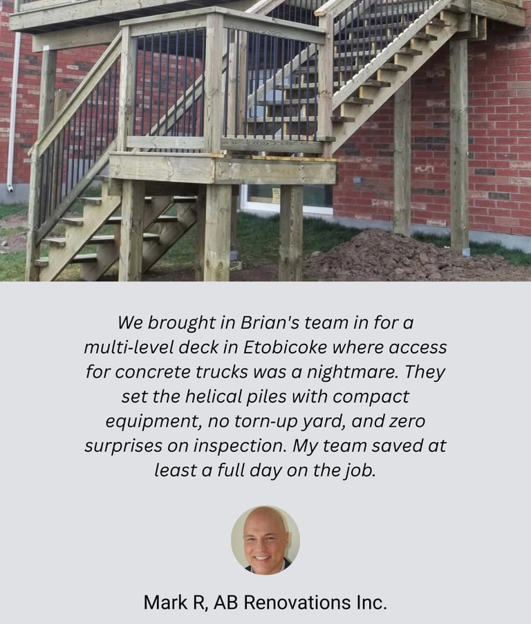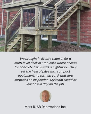 Since 2015, we’ve installed helical pile foundations for a wide range of decks, docks, and home extensions across the Greater Toronto Area—working on everything from backyard residential projects to large-scale commercial builds. We’ve partnered with homeowners, builders, and commercial contractors to deliver stable foundations in a wide variety of soil and site conditions. Our deep understanding of local GTA soils and foundation requirements ensures every project is built on a foundation you can trust.
